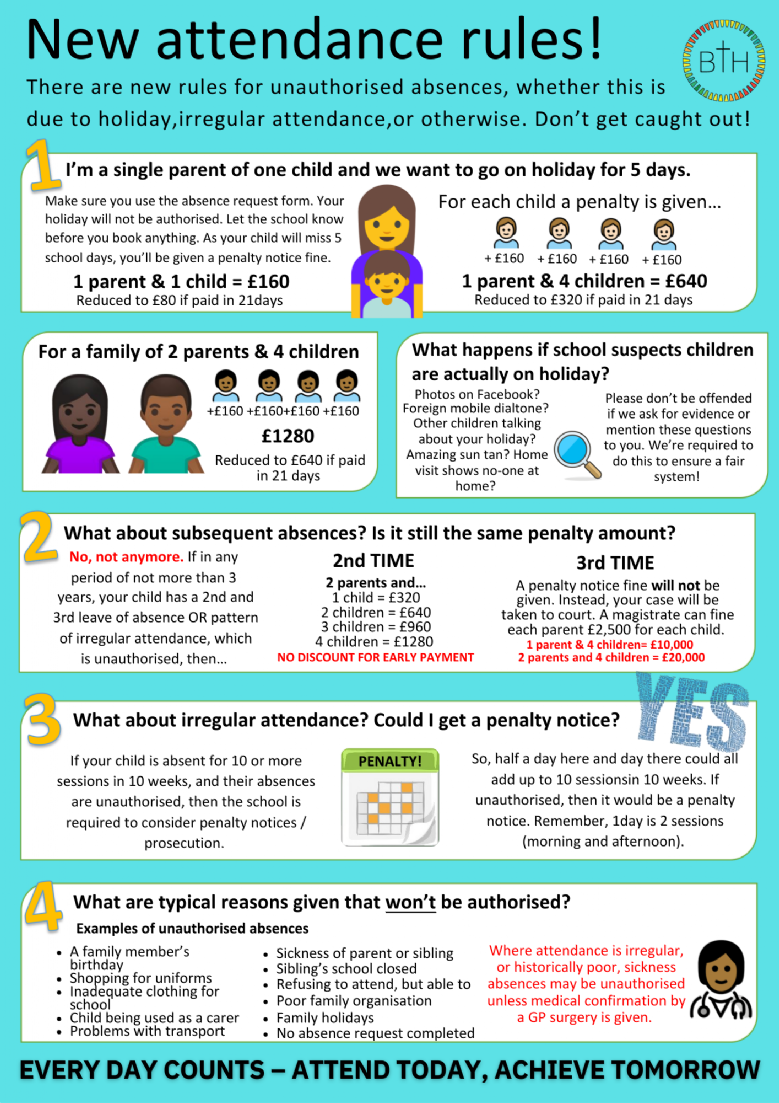 - Penalty Notice/Prosecution: If your child’s attendance does not improve following any or all of the above interventions, the Local Authority may choose to issue parents with a Penalty Notice or prosecute for their children’s non-attendance at college.